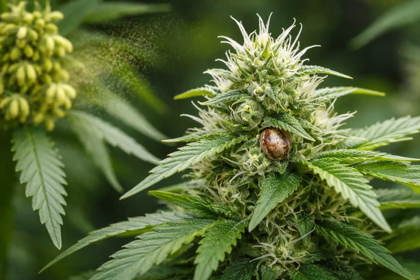 Male cannabis plants develop pollen sacs instead of dense resinous buds. Once mature, these sacs open and release pollen into the surrounding air. Because cannabis is wind-pollinated, even a small amount of pollen can travel and reach nearby female flowers.
